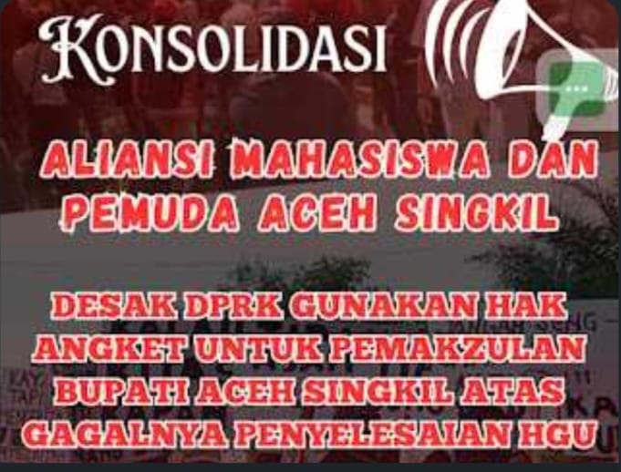 Para mahasiswa dan pemuda menilai kepemimpinan Bupati “Safriadi” gagal menyelesaikan persoalan Hak Guna Usaha (HGU) yang telah menjadi masalah lama di Aceh Singkil.