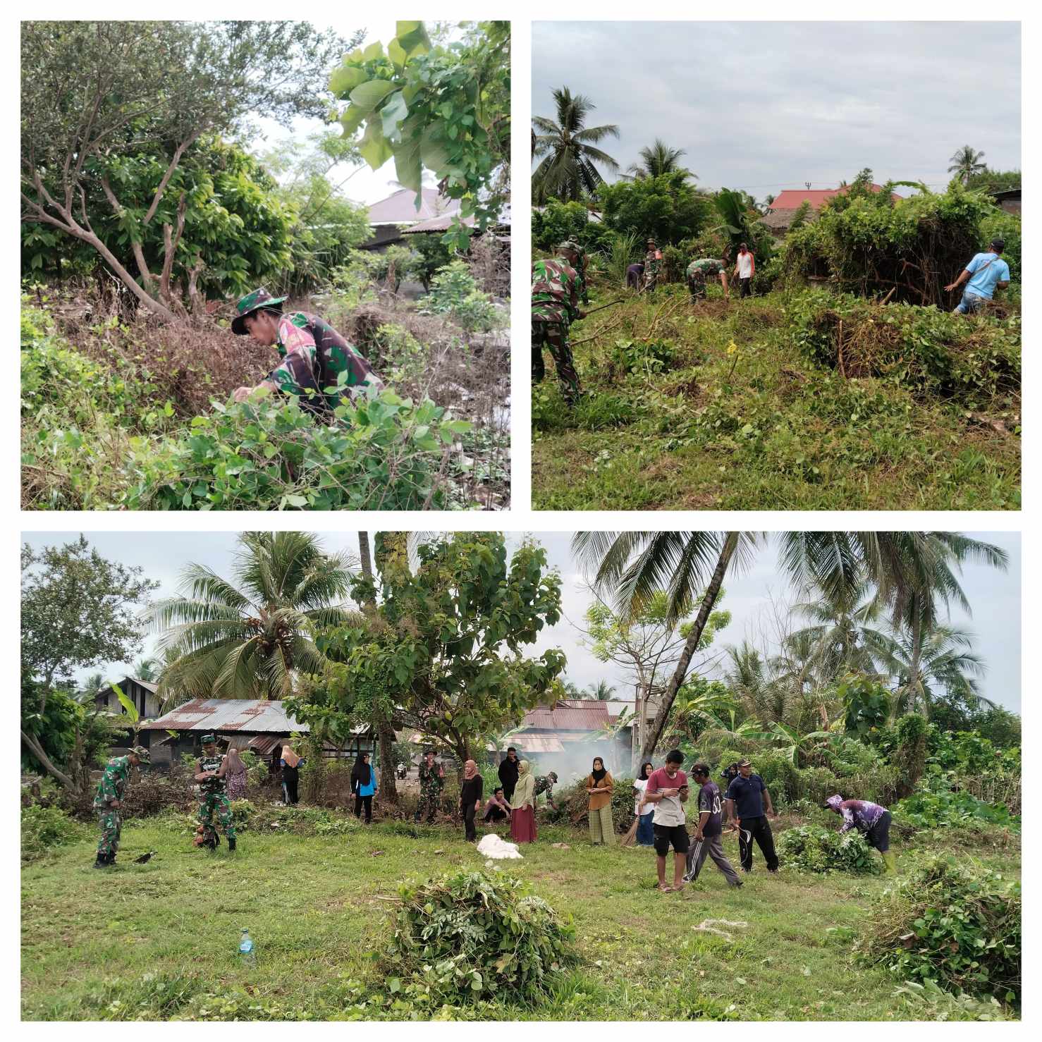 Sertu Fitah Akbar Pulukadang bersama aparat desa dan warga tersebut dengan semangat sambil bercanda ria membersihkan halaman kantor Desa.