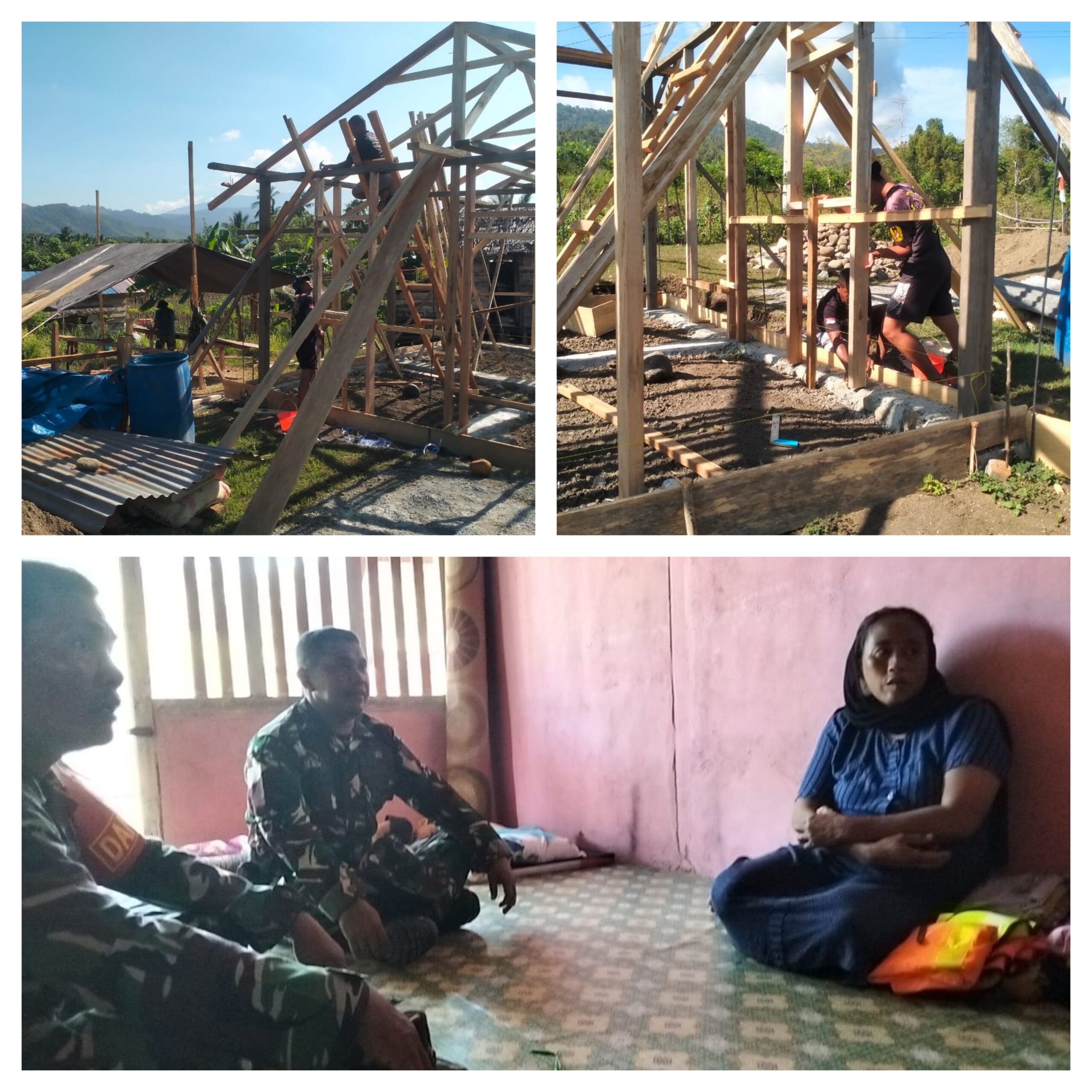 Para prajurit TNI dari Satgas gabungan terlihat kompak dan sigap melakukan pemasangan tiang dinding Dan Dinding Rumah.