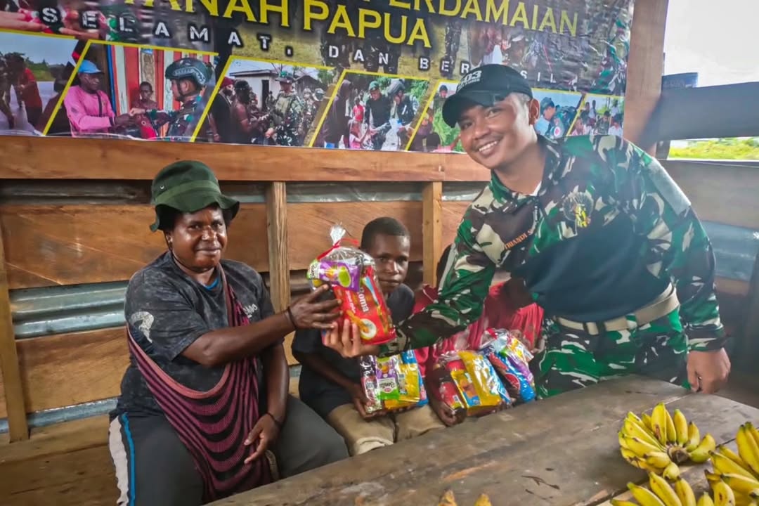 Papua – Ragamrajawalinusantara.id | Satgas Pamtas Mobile RI-PNG Yonif 503 Kostrad memborong semua pisang jualan serta memberikan paket makanan sehat bagi mama dan anak Papua di Pos Kotis Distrik Kenyam, Kabupaten Nduga Papua. Jumat (21/02/2025).
