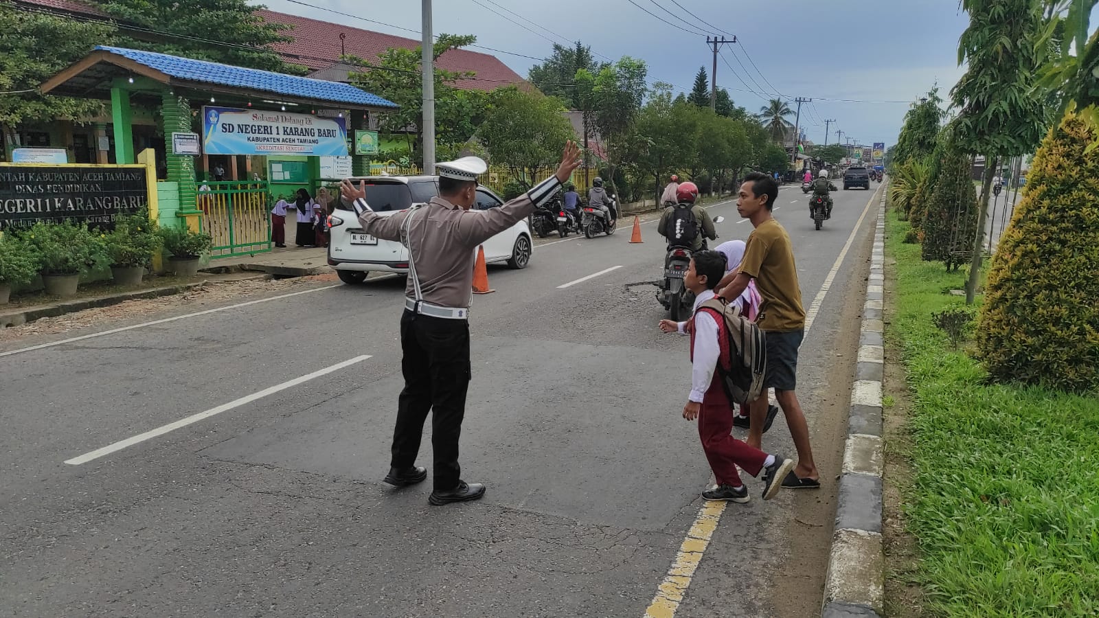 ACEH TAMIANG – Ragamrajawalinusantara.id | Polda Aceh,Personel Unit Turjawali Satlantas Polres Aceh Tamiang Polda Aceh Jajaran Polda Aceh melaksanakan kegiatan pengaturan lalu lintas (Gatur Lalin) pada zona aman Sekolah.