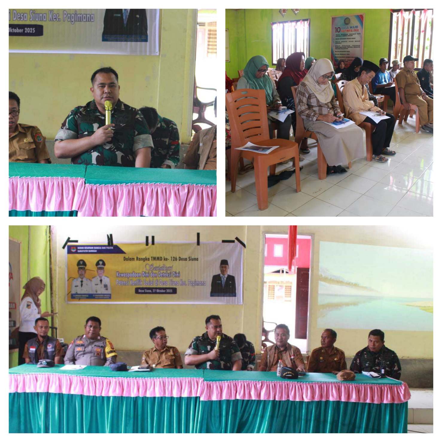 Kegiatan Berlangsung Di Aula Desa Siuna, Kecamatan Pagimana Kabupaten Banggai, dihadiri Langsung Dansatgas TMMD Ke 126 Letkol Kav La Ode Azhar Hamid S.H.,M.Han dan menghadirkan narasumber Kepala Kesbangpol Kabupaten Banggai bapak Syaifudin Muid, Camat Pagimana ,Kapolsek Pagimana, Danramil 1308–07/Pagimana Peltu Yanto L Balubi.. dan Pemateri Dari Kesbangpol 2 Orang dan Kades Siuna Sumitro Musa dan Masyarakat Desa Siuna.