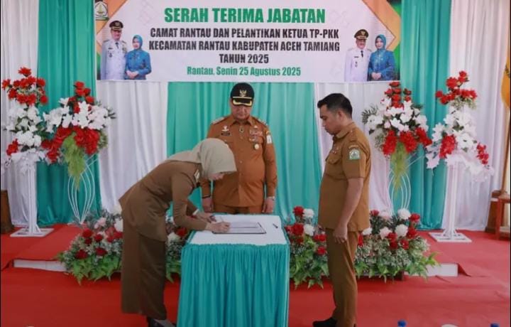 Aceh Tamiang – ragamrajawalinusantara.id | Bupati Aceh Tamiang, Irjen Pol. (P) Drs. Armia Pahmi, MH menghadiri serah terima jabatan (Sertijab) Camat Rantau dari Muhammad Hans Martha Kesuma, S.STP, M.SP kepada Desy Nuriza, S.STP, MM serta pelantikan Ketua TP-PKK dan Bunda PAUD Kec. Rantau di Kantor Camat, Senin, (25/8/25).