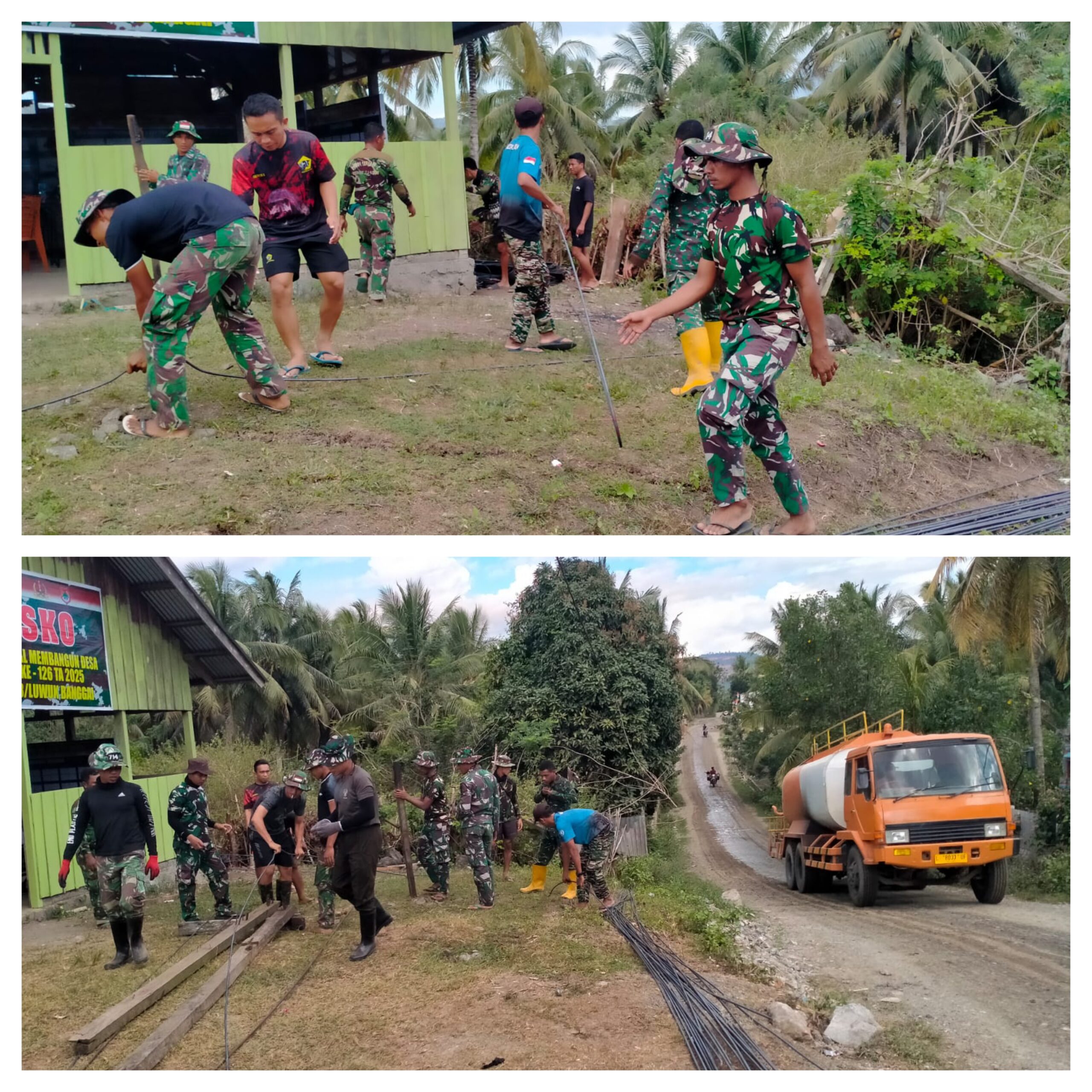 Semangat dan Kekompakan personel Satgas TMMD Kodim 1308/LB yang Bahu Membahu Bersama warga Merangkai besi Sebagai Bahan nya Pembangunan Plat Duiker yang menjadi Prioritas Sasaran Fisik Di TMMD Kali ini.