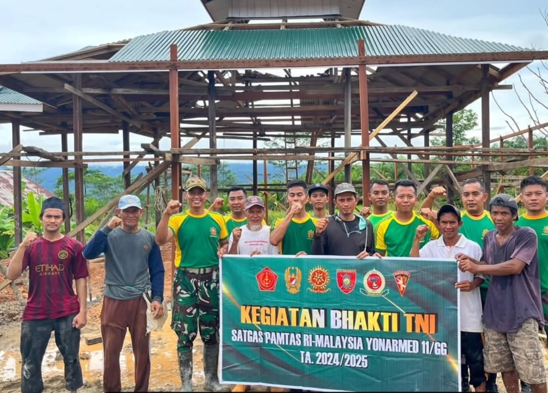 Nunukan – Ragamrajawalinusantara.id | Kebersamaan dan semangat gotong royong kembali diperlihatkan oleh personel Satuan Tugas Pengamanan Perbatasan (Satgas Pamtas) Yonarmed 11 Kostrad Pos Simanggaris Lama bersama masyarakat dalam pembangunan mushola di Desa Tabur Lestari, Kecamatan Simanggaris, Kabupaten Nunukan. Rabu (12/2 2025).