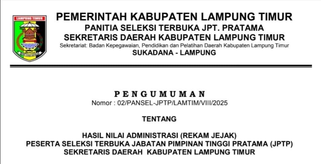 Panitia Seleksi Terbuka Jabatan Pimpinan Tinggi Pratama (JPTP) Sekretaris Daerah Kabupaten Lampung Timur resmi mengumumkan hasil nilai administrasi atau rekam jejak para peserta seleksi.