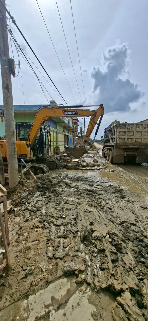 “kita menurunkan sebanyak 6 unit alat berat excavator dan 5 unit mobil dumptruck yang merupakan bantuan dari Bapak Wakapolri Komjen. Pol Prof. Dr. Dedi Prasetyo dan kemudian kita drop ke daerah pemukiman warga untuk membersihkan lumpur dan sisa sisa material yang masih menumpuk, salah satu nya di desa Bundar Kecamatan Karang Baru. ” Ucap Kapolres.