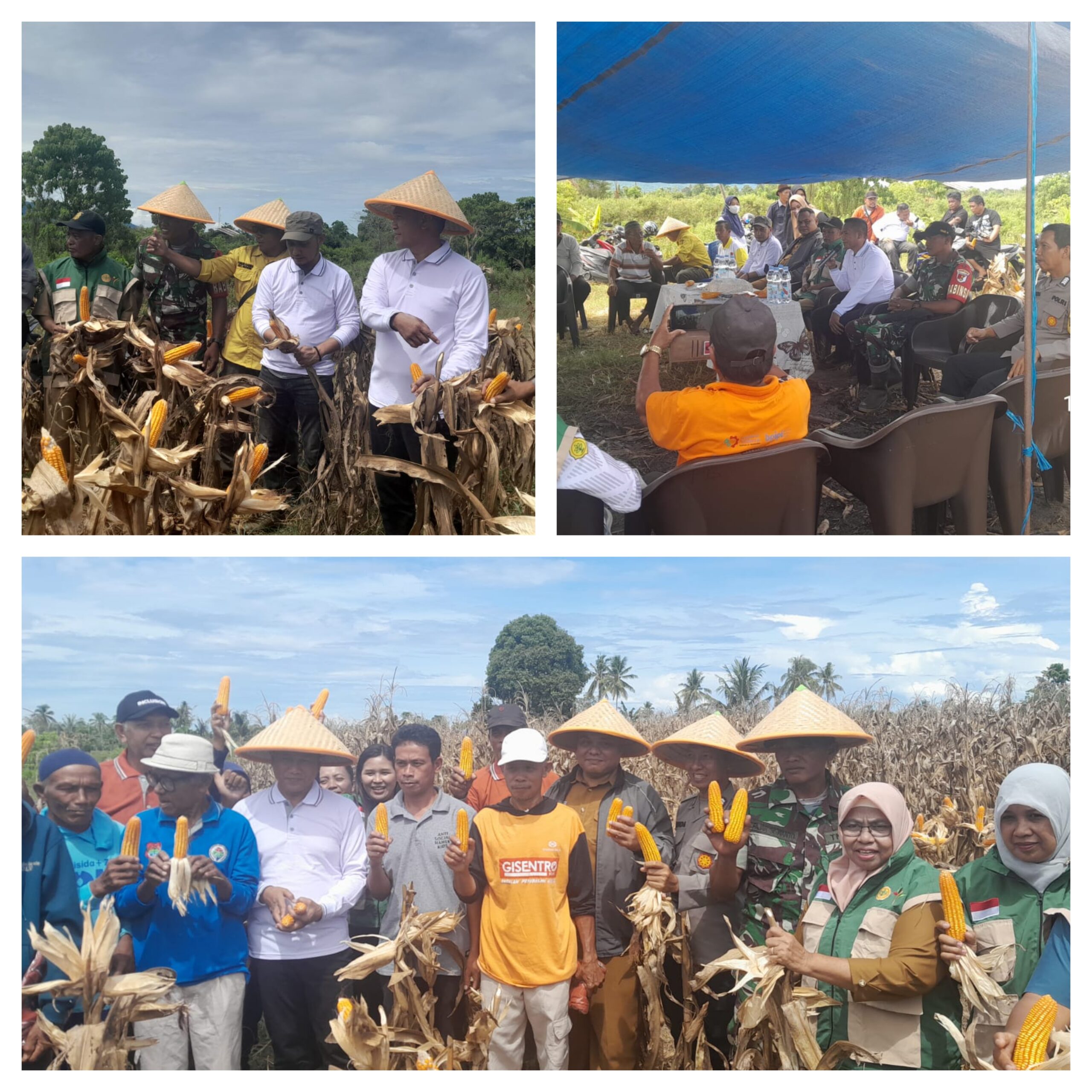 Kegiatan panen raya tersebut berlangsung dalam suasana penuh kebersamaan. Para peserta yang hadir tampak berada di hamparan kebun jagung yang siap panen, menunjukkan hasil kerja keras para petani setempat. Dalam foto terlihat para peserta kegiatan, termasuk Babinsa dan penyuluh pertanian, sedang memantau kualitas hasil panen serta berdialog langsung dengan petani di lapangan. Pendampingan ini menjadi bentuk dukungan nyata TNI AD melalui Babinsa terhadap para petani dalam meningkatkan produktivitas pertanian daerah.