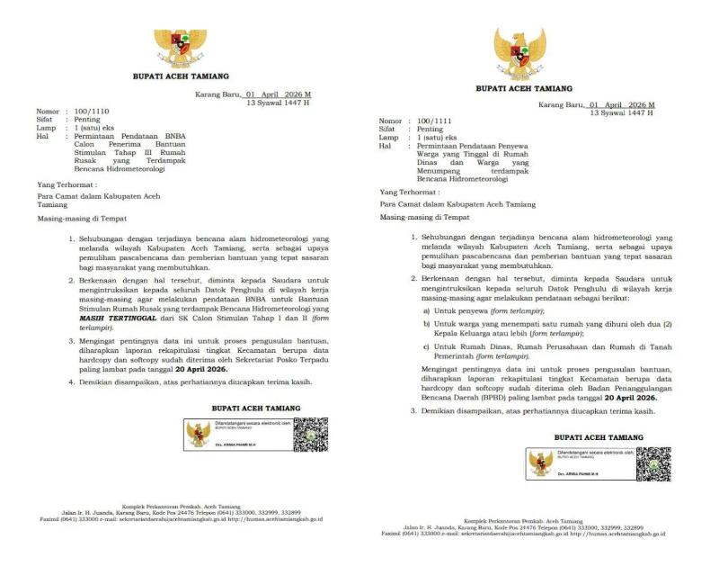 Adapun batas akhir penyampaian laporan rekapitulasi dari tingkat kecamatan ditetapkan hingga 20 April 2026. Laporan tersebut harus diserahkan dalam bentuk bentuk hardcopy maupun softcopy kepada Sekretariat Posko Terpadu dan BPBD Aceh Tamiang.