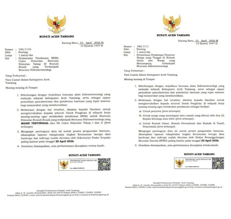 Adapun batas akhir penyampaian laporan rekapitulasi dari tingkat kecamatan ditetapkan hingga 20 April 2026. Laporan tersebut harus diserahkan dalam bentuk bentuk hardcopy maupun softcopy kepada Sekretariat Posko Terpadu dan BPBD Aceh Tamiang.
