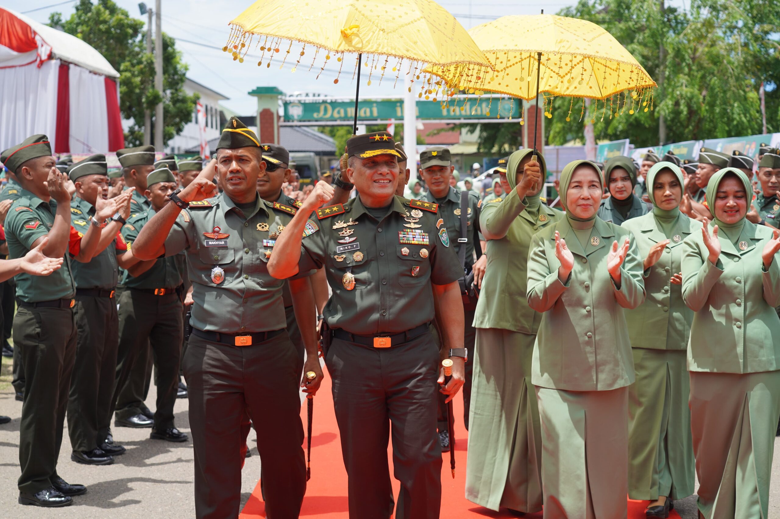 LHOKSEUMAWE- Ragamrajawalinusantara.id | Panglima Komando Daerah Militer Iskandar Muda (Pangdam IM), Mayor Jenderal TNI Niko Fahrizal, M.Tr (Han), didampingi Ketua Persit KCK Daerah Iskandar Muda, Ny. Eva Niko Fahrizal, melaksanakan kunjungan kerja di Makodim 0103/Aceh Utara yang disambut langsung oleh Dandim 0103/Aceh Utara Letkol Kav Makhyar S.T.,M.M.,M.H.I., dan Ketua Persit KCK Cabang XX Dim 0103 Ny. Raena Maidelsa Makhyar.