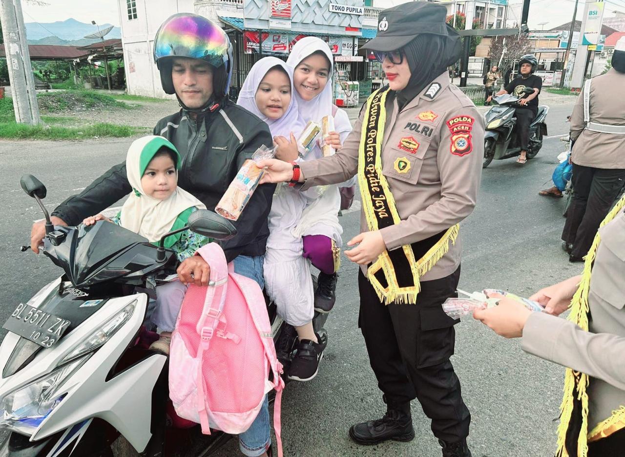 Selain mengatur arus lalu lintas secara profesional, Polwan juga membagikan souvenir kepada pengendara yang mematuhi peraturan lalu lintas dan memiliki kelengkapan surat-surat kendaraan.