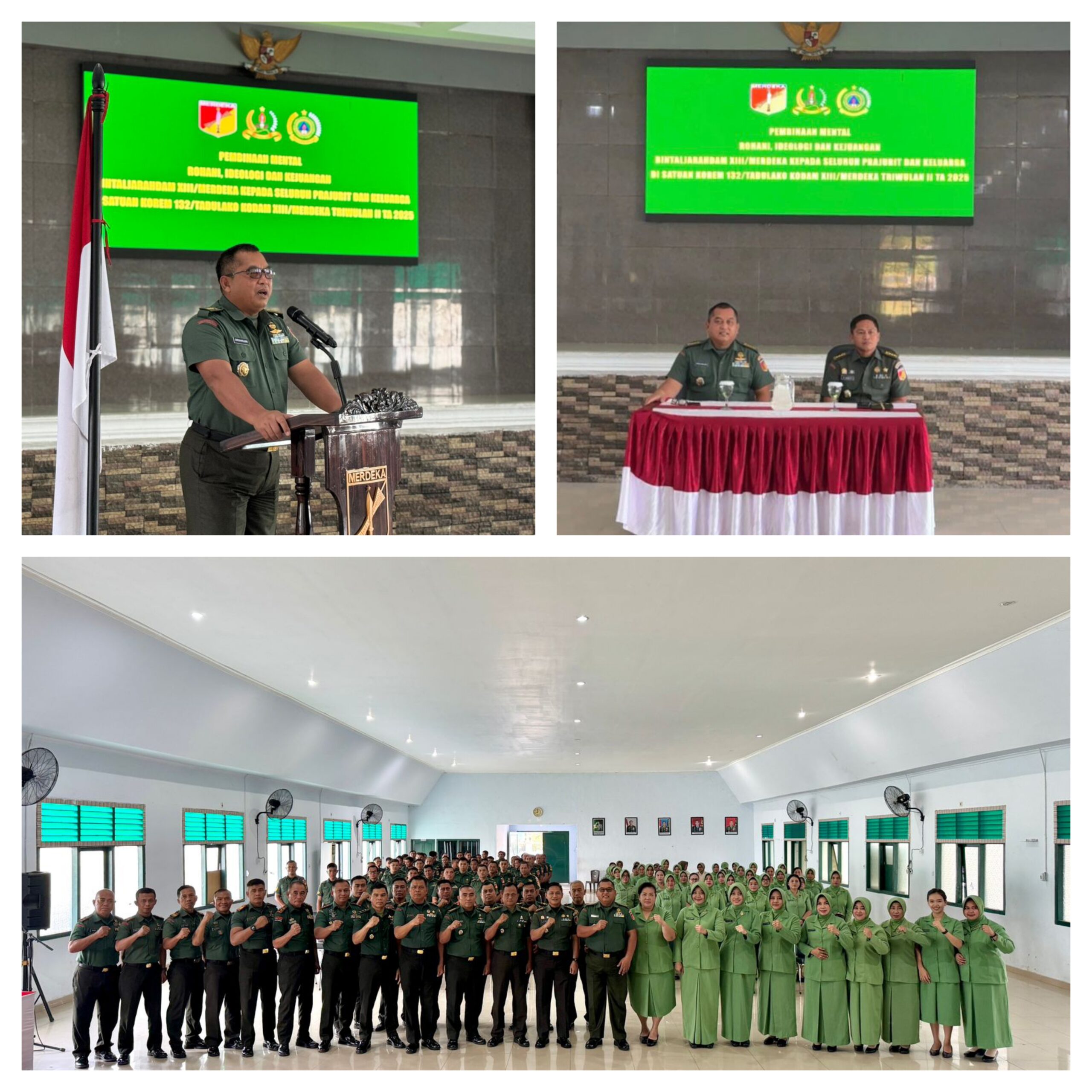 PALU,Ragamrajawalinusantara.id   – Seluruh prajurit dan keluarga besar Korem 132/Tadulako mengikuti kegiatan Pembinaan Mental Rohani, Ideologi, dan Kejuangan yang dilaksanakan oleh Pembinaan Mental dan Sejarah (Bintaljarah) Kodam XIII/Merdeka di Aula Manggala Sakti, Makorem 132/Tadulako, Palu, Sulawesi Tengah, Rabu (7/5/2025).