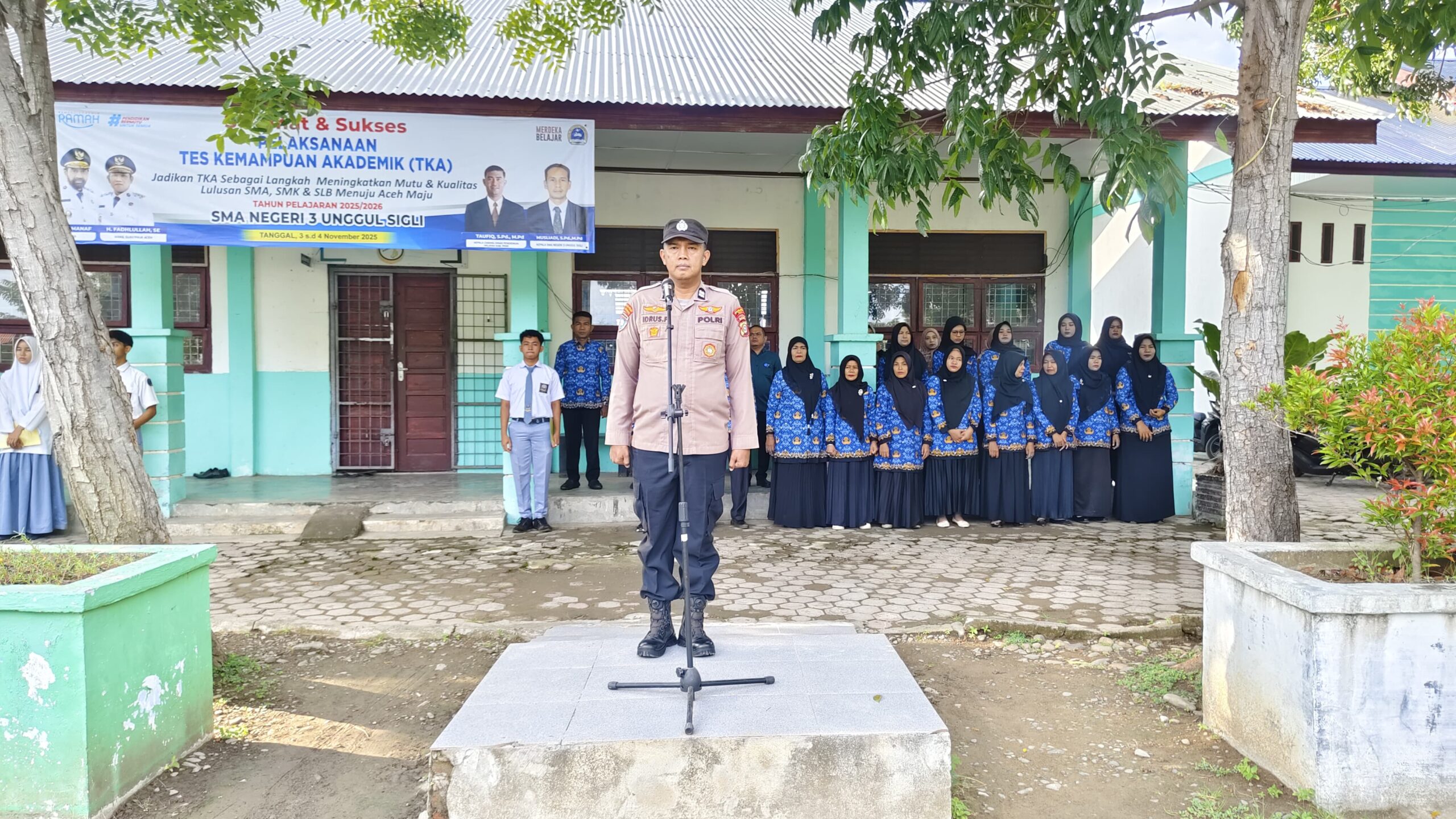 Personel Satuan Binmas Polres Pidie bertindak sebagai Pembina Upacara Bendera di SMA Negeri 3 Unggul Sigli, Kabupaten Pidie, dengan memberikan edukasi mengenai bahaya narkoba, kenakalan remaja, bullying, penggunaan media sosial, tertib berlalu lintas, hingga pemahaman tentang unjuk rasa.