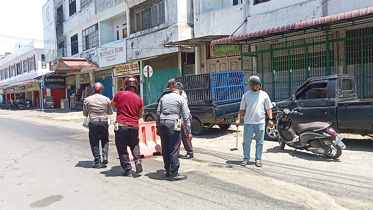 Satlantas Polres Pidie Tangani Tumpahan Minyak di Jalan Perniagaan, Arus Lalu Lintas Kembali Lancar