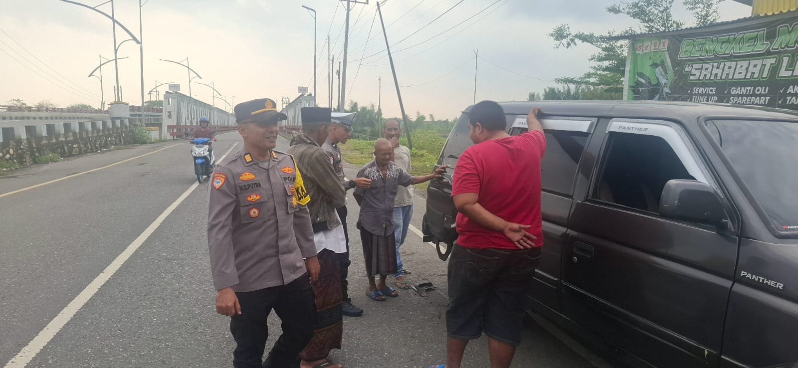 Dipimpin oleh AKP Hendra Saputra, S.E., bersama Aipda M. Rizal, Bripda Kahfi Putra Hakim, dan Bripda Azizi Azzaini, petugas patroli mendapati seorang pemudik mengalami kerusakan kendaraan di tengah perjalanan.