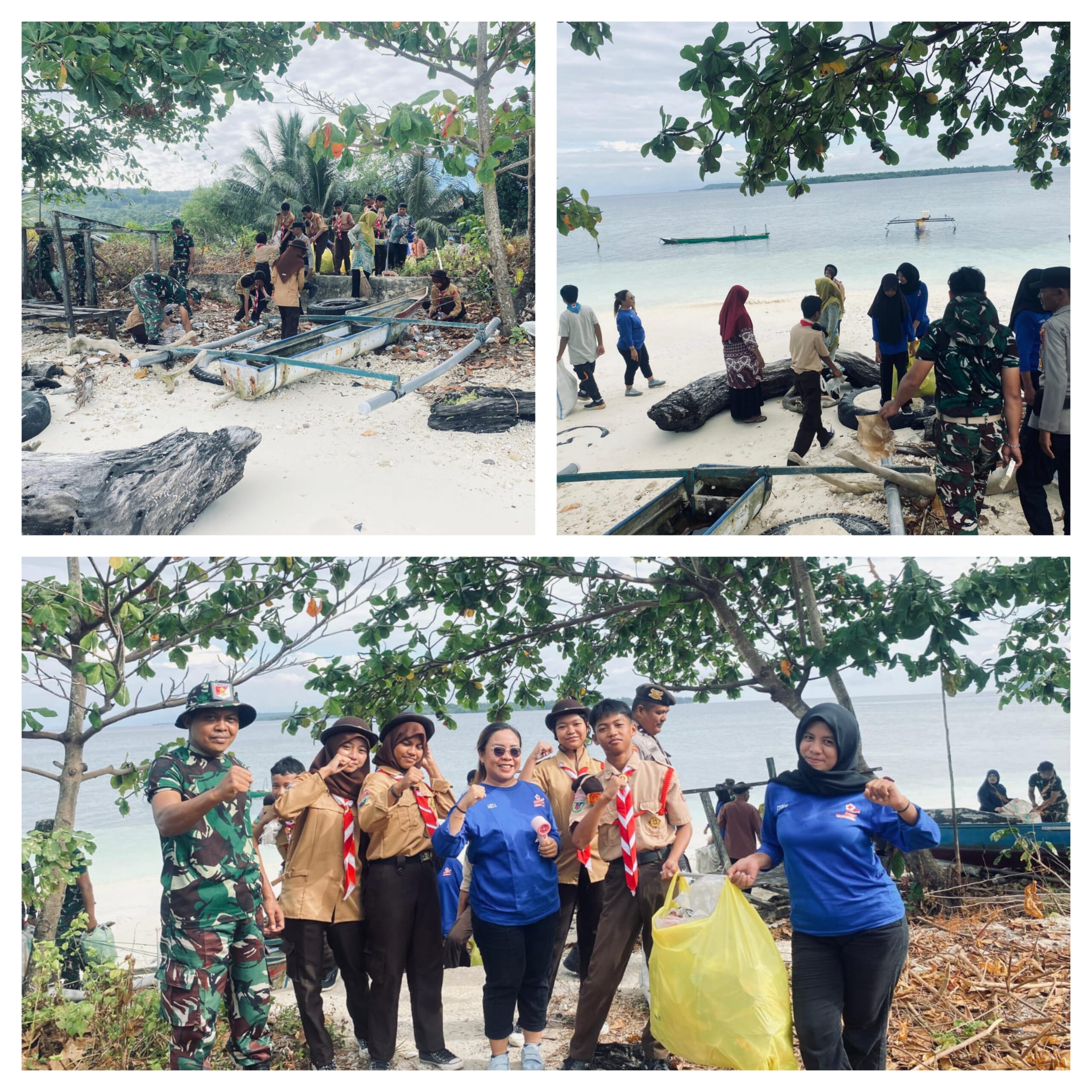Tampak Pasukan Loreng TNI AD ,Anggota Polsek Tinangkung Dan Forkompincam Tinangkung Dan Siswa Siswi SMPN I Tinangkung kompak dalam kebersamaannya dengan masyarakat mengangkat sampah di sekitar pantai.