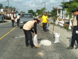 Aceh Timur: Ragamrajawalinusantara.id_ Dalam rangka mendukung proses pemulihan wilayah pasca banjir, Polsek Nurussalam melakukan kegiatan perbaikan jalan lintas Medan-Banda Aceh, tepatnya di ruas Jembatan Bagok, Kecamatan Nurussalam, pada Jumat (23/01/2026). Kegiatan ini fokus pada penyematan bagian jalan yang berlubang di lintasan jalan propinsi yang sering digunakan oleh masyarakat dan kendaraan umum.
