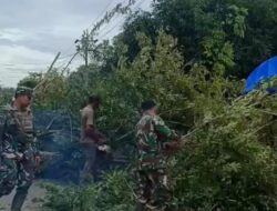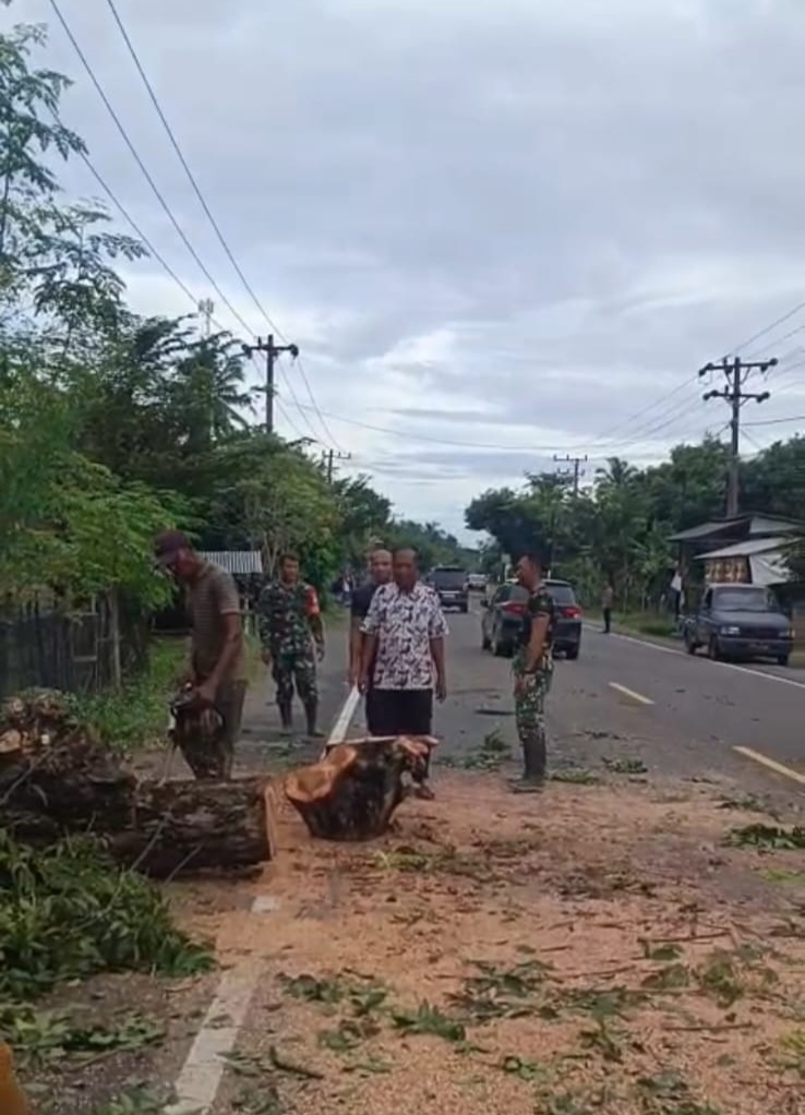 Aceh Timur:Ragamrajawalinusantara.id_ Musim hujan dan angin kencang yang mengguyur Aceh Timur menjadi pemicu langkah cepat dari Kapolsek Nurussalam Iptu Deshery beserta jajarannya, dibantu anggota Koramil Nurussalam dan warga setempat, untuk memotong pohon kayu besar yang berada di pinggir jalan lintas Medan-Banda Aceh. Sabtu 27/12/2025