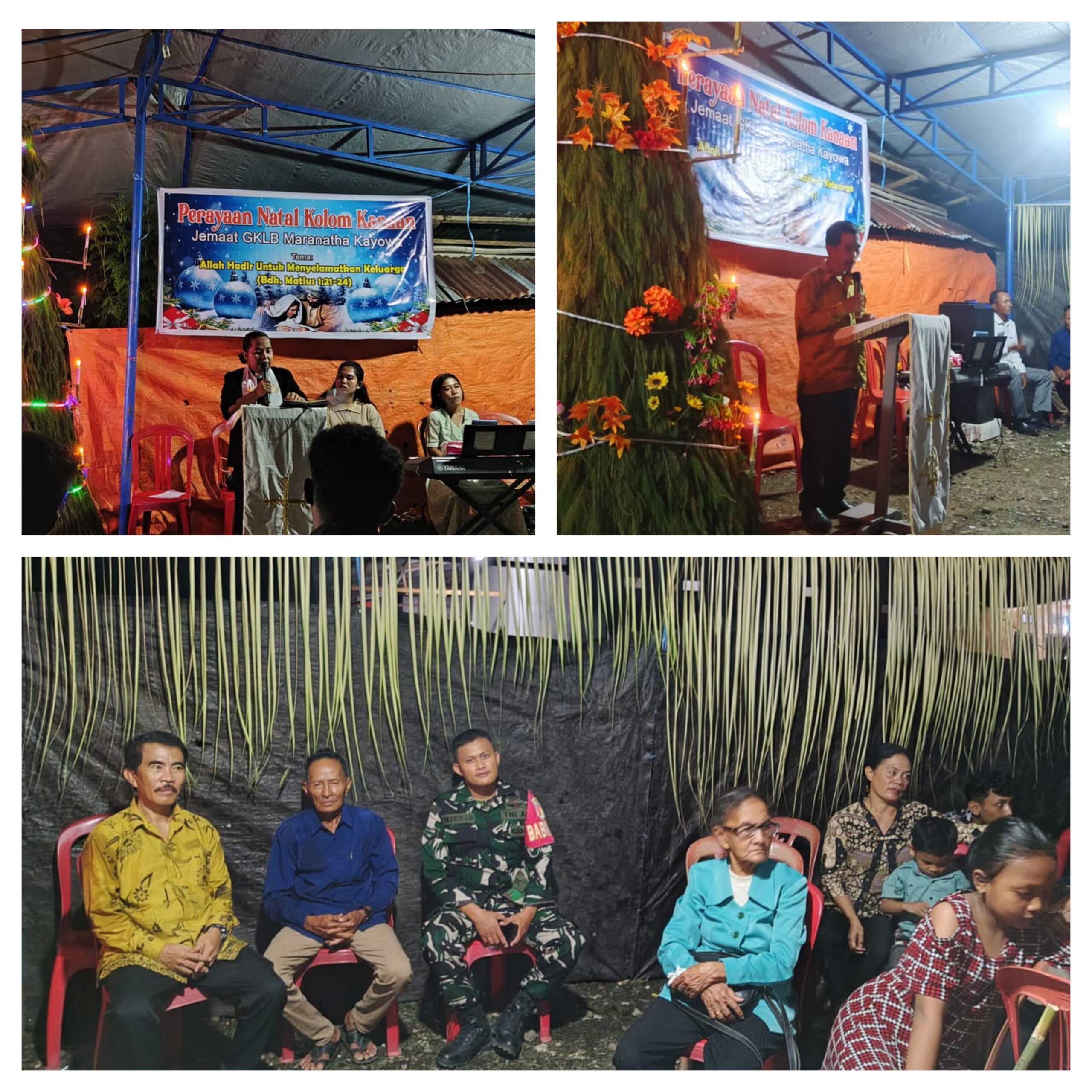 BATUI,Ragamrajawalinusantara.id  – Dalam rangka memberikan rasa aman dan nyaman bagi umat Kristiani yang menjalankan ibadah, Babinsa Desa Kayowa Koramil 03/Batui Kodim 1308/LB, Serda Zulfikri G. M, melaksanakan kegiatan pengamanan dan pemantauan Perayaan Natal Kolom Kanaan Jemaat GKLB Maranatha Kayowa Dengan Tema “Allah Hadir Untuk Menyelamatkan Keluarga” oleh Pendeta Ibu Natalia Labotano S,th.Bertempat Di Desa Kayowa, Kecamatan Batui Kabupaten Banggai.Senin (22/12/2025).